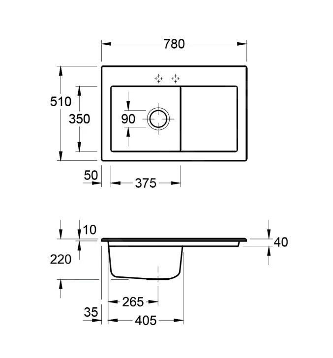 - totale afmeting van de spoelbak: 780 × 510 mm